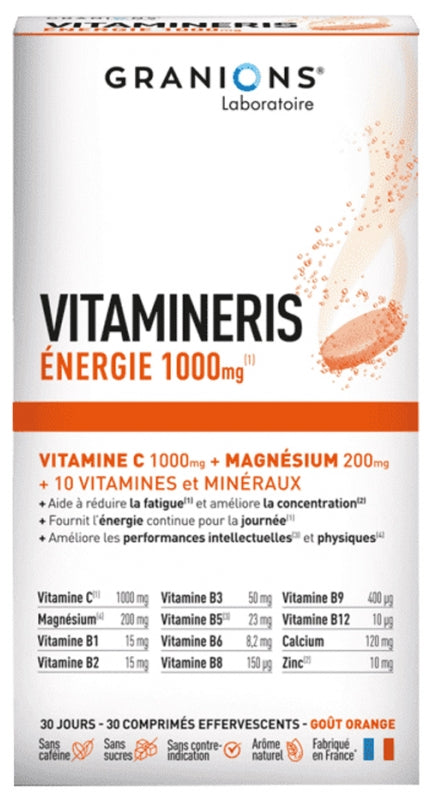 Granions Vitamineris Énergie 1000 mg 30 Comprimés Effervescents est un complément alimentaire qui contient un concentré de 9 vitamines et 3 minéraux pour soutenir votre forme physique et mentale au quotidien.
