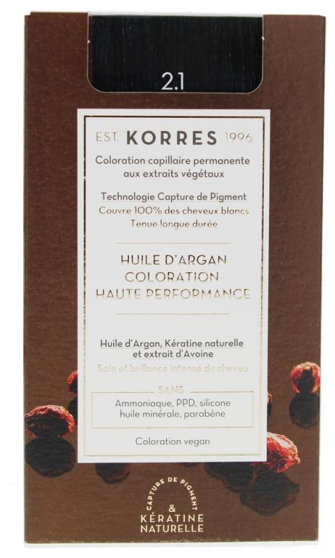Korres Coloration Permanente Huile d'Argan - Coloration : 2.1 Noir Bleuté est une coloration capillaire permanente haute performance à l'huile d'argan qui couvre 100% des cheveux blancs dès la première application. Elle offre une couleur éclatante, une tenue longue durée tout en renforçant et en protégeant les cheveux des agressions quotidiennes.