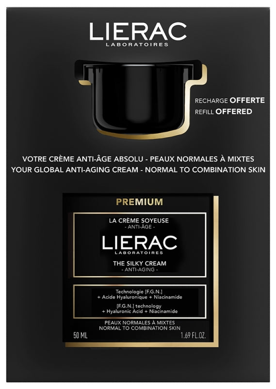 Lierac Premium La Crème Soyeuse 50 ml + La Crème Soyeuse Recharge 50 ml Offerte est une crème permettant d'hydrater la peau et de corriger tous les signes de l'âge : rides, ridules, taches, manque de fermeté, d'élasticité, de densité et d'éclat, déshydratation.