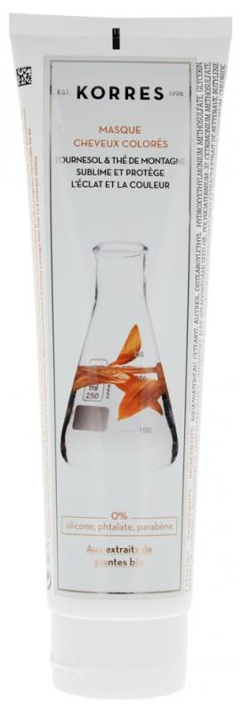 Korres Masque Cheveux Colorés 125 ml est un masque capillaire réparateur pour cheveux colorés au tournesol et thé des montagnes. Il sublime et protège l'éclat et la couleur.Sans silicone, phtalate, parabène.89,5% de contenu d'origine naturelle.