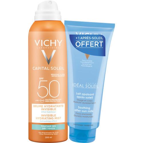 Vichy Idéal Soleil Invisible Hydrating Mist SPF50 200ml + Soothing After-Sun Milk 100ml Free is a duo of cares for a sun ritual, specially dedicated to the sensitive skins.