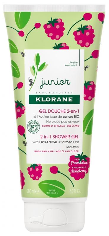 Klorane Junior 2in1 Shower Gel Body and Hair 200 ml - Fragrance: Raspberry is a shower gel with a melting formula enriched with nutritive and biodegradable agents that gently cleanses the skin and hair with a light, easy-to-rinse lather that does not irritate the eyes.