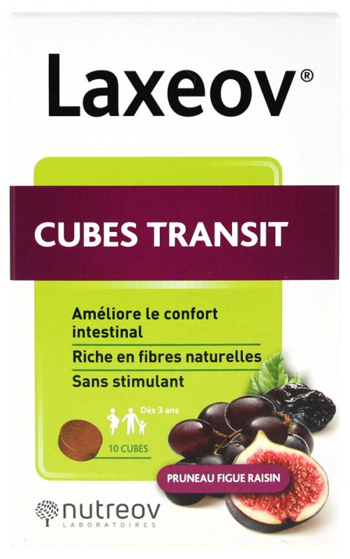Nutreov Laxeov Cubes Transit 10 Cubes est un complément alimentaire sous forme de cube. La formule exclusive associe différentes sources de fibres sélectionnées pour leur rôle dans le confort intestinale : son de blé, fibres de pomme, fibres d'avoine et inuline de chicorée. Grâce à ses actifs 100% d'origine naturelle, à un dosage optimal et à sa teneur en fibres, le cube vous permet une utilisation quotidienne. Goût pruneau - figue -raisin, proche de la pâte de fruits. Convient à toute la famille dès 3 ans et chez les femmes enceintes. Ne contient pas de stimulant. Fabriqué en France.