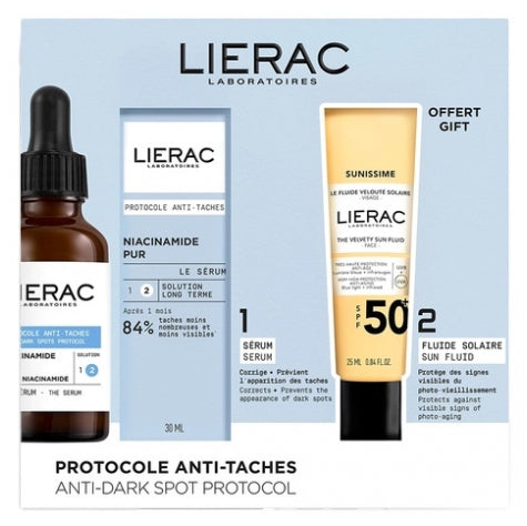 Lierac Protocole Sérum Anti-Taches Niacinamide Pur 30 ml + Sunissime Le Fluide Velouté Solaire Visage SPF50+ 25 ml Offert est un ensemble de soins complet pour une peau lumineuse et protégée du soleil.