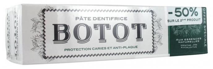 Botot Pâte Dentifrice Menthe Pin Eucalyptus Lot de 2 x 75 ml est une pâte dentifrice inspirée de la formule originale de la fameuse Eau de Botot, spécialement mise au point par le Roi Louis XV.